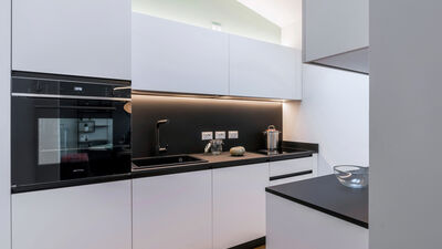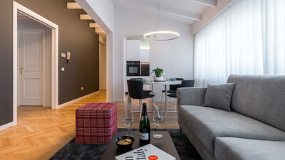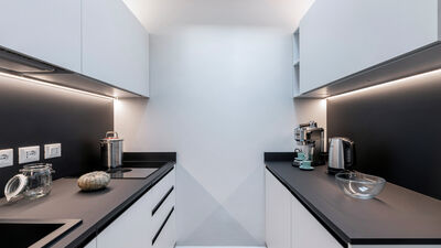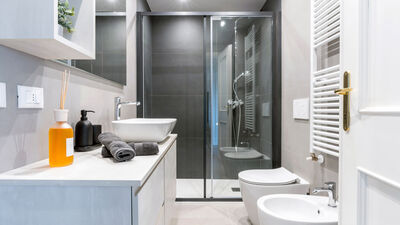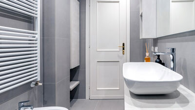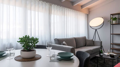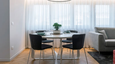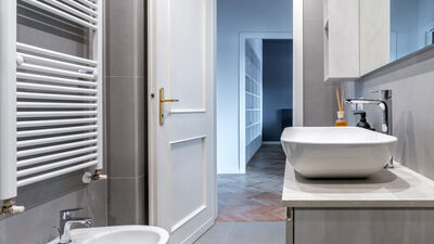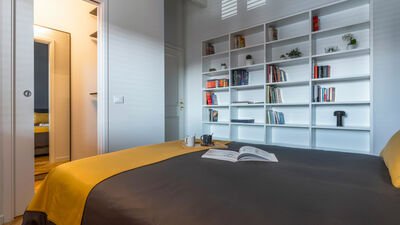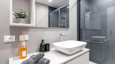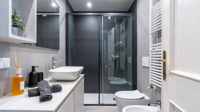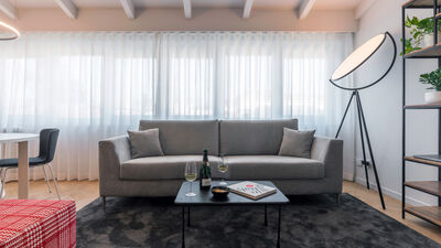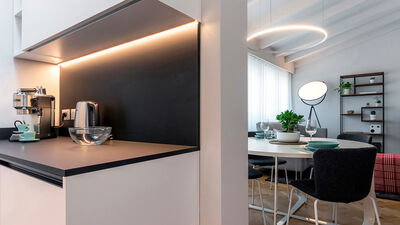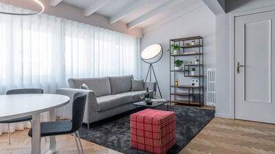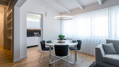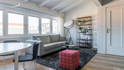 The Chiaroscuro apartment, fully renovated in 2024, is located on the second and top floor of a building with five apartments (no elevator). Its contemporary design plays with shades of grey, warmed by wooden parquet flooring that unifies all the spaces, and stands out for its attention to detail.