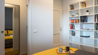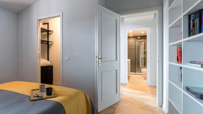 The master bedroom, overlooking the quiet inner courtyard, also includes a convenient walk-in closet. Opposite the bedroom is the bathroom, featuring a spacious shower, heated towel rack, and modern finishes.